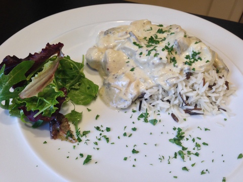 - Chicken stroganoff, wild rice and green salad. This is a very simple dish which belies it’s great flavour. The chicken, sourced from my butcher just round the corner, was tender and succulent; the mainstay of the flavours coming from a combination of mustards and white wine in the sauce. A vegetarian alternative was also provided of mushrooms done in a white wine and cream sauce.