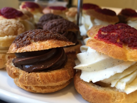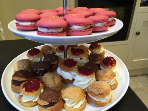- Choux au craquelin – my inspiration from these is yet again my ‘Pâttiserie’ recipe book. The topping is a simple dough of sugar, flour & butter (with the addition of any colouring & flavouring if so required). It is rolled out, like pastry, very thinly, cut into tiny discs and, once the choux dough is piped onto the baking tray, the discs are placed on the top of the bun and then baked. The effect is a delightful crunchy cream puff. There were three flavours: chocolate, vanilla & raspberry.